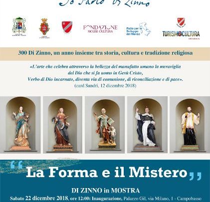 La mostra dedicata al Di Zinno in occasione delle celebrazioni per il tricentenariod ella nascita si intitola ‘La Forma e il Mistero’. Promossa dal Comitato pro Di Zinno, Arcidiocesi di Campobasso- Boiano, Mibac, Regione Molise, è sostenuta dall’assessorato al Turismo e Cultura, che vede come ente attuatore la Fondazione Molise Cultura, con il contributo di Sviluppo Molise e Patto Territoriale per il Molise.