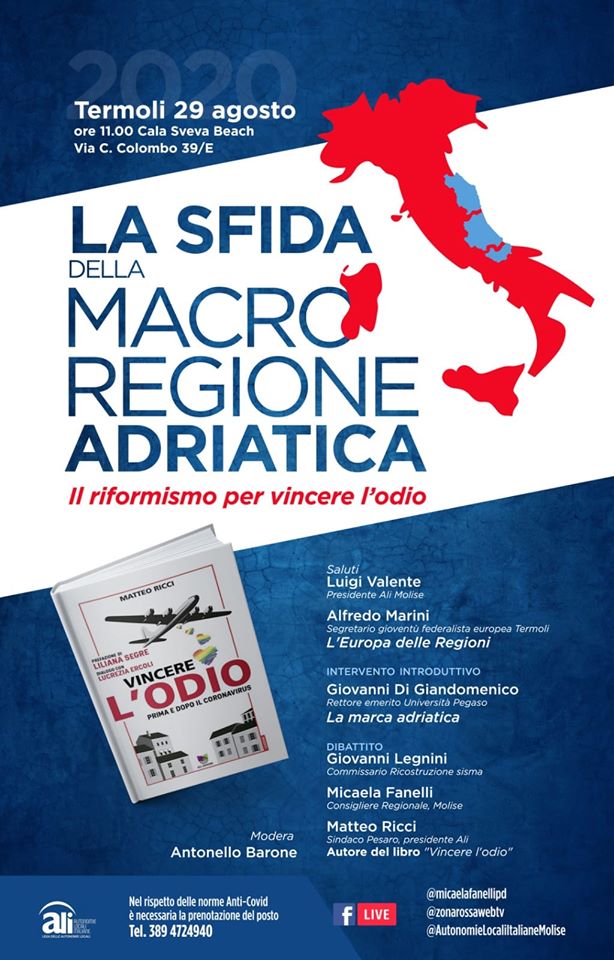 Domani, sabato 29 agosto 2020, alle ore 11,00 al Cala Sveva Beach di Termoli, si svolgerà l’incontro dal titolo “La sfida della Macroregione Adriatica. Il riformismo per vincere l’odio”. Interverranno Luigi Valente, presidente Ali Molise, Alfredo Marini, segretario gioventù federalista europea Termoli, Giovanni Di Giandomenico, rettore emerito Università Pegaso, Giovanni Legnini, commissario straordinario alla ricostruzione, Micaela Fanelli, consigliere regionale Molise, Matteo Ricci, sindaco di Pesaro, Presidente Ali, autore del libro “Vincere l’odio”.