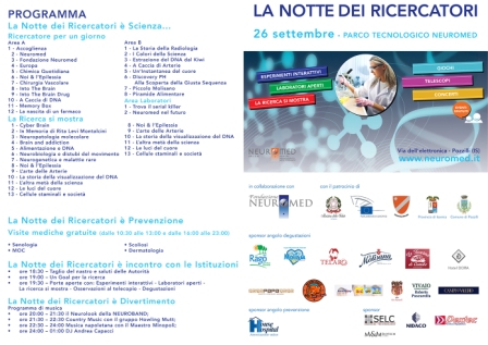 Tutto pronto al Parco tecnologico del Neuromed di Pozzilli per la ‘Notte dei Ricercatori’. Ai nastri di partenza gli specialisti, gli astronomi, lo staff, un gruppo di circa cento persone che contribuirà a rendere l’iniziativa una delle più importanti del centro-sud Italia nel settore della scienza. Più di milleduecento gli studenti venerdì, 26 settembre, diventeranno ‘ricercatore per un giorno’ interagendo con i ricercatori e seguendo le attività scientifiche che sono state inventate per loro. Si inizia alle 9:30 del mattino, per proseguire fino alle 18 con ‘Aspettando la Notte dei Ricercatori’, programma dedicato alle scuole.