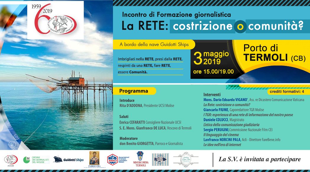 L’incontro, che si terrà alle 15,00 di venerdì 3 maggio, sulla nave Guidotti Ships attraccata al porto di Termoli, vedrà la partecipazione straordinaria di mons. Dario Edoardo Viganò, Assessore alla Comunicazione del Dicastero Vaticano per la Comunicazione.