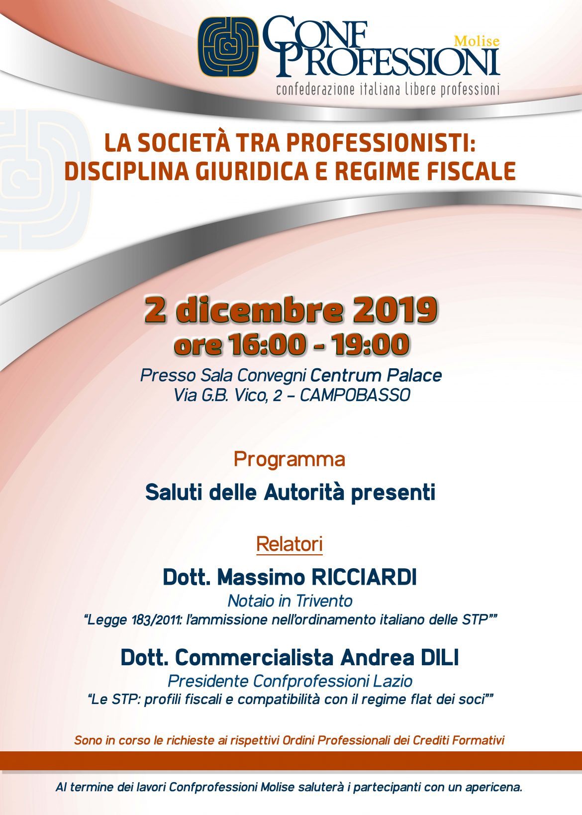 “La società tra professionisti: disciplina giuridica e regime fiscale”: è il titolo del convegno organizzato da Confprofessioni Molise, che si terrà lunedì 2 dicembre 2019.