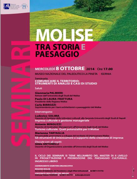 Comunicare il territorio: un mestiere affascinante, ma soprattutto un’esigenza per quelle aree geografiche come il Molise che tanto hanno ancora da dire in fatto di paesaggio culturale e promozione. “Comunicare il territorio: strumenti di analisi e casi di studio” è proprio l’argomento del seminario in programma domani, mercoledì 8 ottobre, a Isernia, nell’ambito del ciclo di incontri aperti a tutti, dal titolo ‘Molise tra storia e paesaggio’. Dalle 17, l’auditorium del Museo nazionale del Paleolitico ‘La Pineta’ ospiterà tanti addetti ai lavori, autorità della scena politica e culturale regionale e relatori importanti, primo fra tutti, sul tema principale, il professor Ludovico Solima, docente di Gestione delle istituzioni culturali alla Seconda Università di Napoli. A seguire gli interventi del professor Antonio Minguzzi, docente di Destination Management all’Università del Molise, che parlerà di ‘Turismo culturale e potenzialità per il Molise’ e la dottoressa Marianna Tartaglia, responsabile Promozione e Sviluppo del territorio, di Unioncamere Molise, sul tema ‘Gli strumenti di Unioncamere a supporto della creazione di impresa’. Coordinerà i lavori e il dibattito la professoressa Gilda Antonelli, docente di Organizzazione aziendale all’Università degli Studi del Molise. All’iniziativa è collegata la formazione comune del master di II livello in “Progettazione e promozione del paesaggio culturale”, organizzato da Università del Molise, Regione e Direzione regionale per i Beni culturali e paesaggistici.
