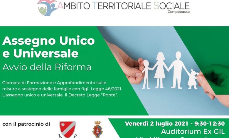 Domani 2 luglio si terrà a Campobasso il convegno sull’Assegno unico e universale e l’avvio della riforma. L’incontro si svolgerà presso l’Auditorium ex GIL, dalle 9.30 alle 12. 30, e sarà una giornata di formazione e approfondimento sulle misure a sostegno delle famiglie con figli Legge 46/2021. L’evento è organizzato dall’Ambito Territoriale Sociale di Campobasso con il Patrocinio della Regione Molise e del Comune di Campobasso, in collaborazione con il Gruppo AWA e l’UCI Coordinamento Regionale Molise.