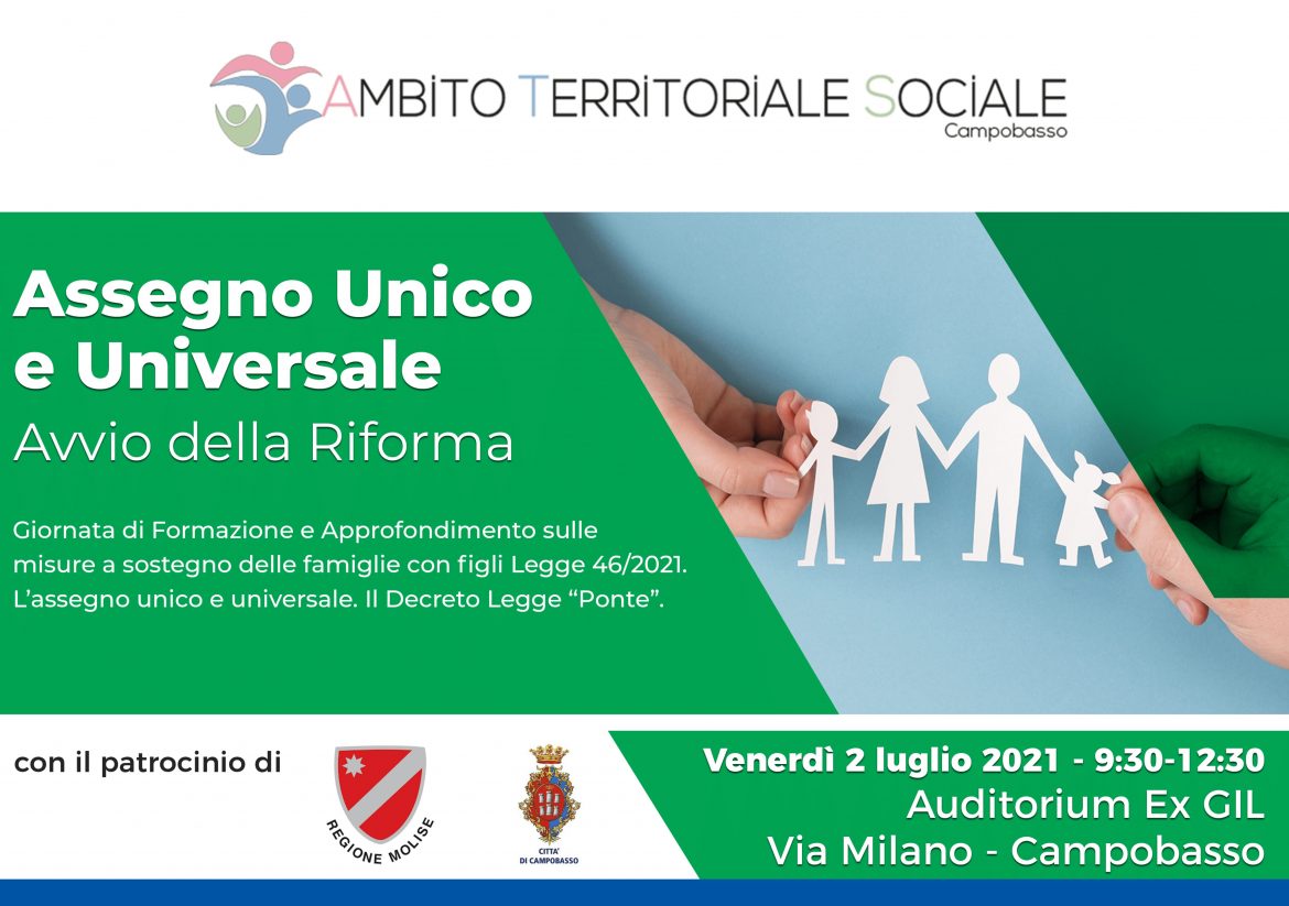 Domani 2 luglio si terrà a Campobasso il convegno sull’Assegno unico e universale e l’avvio della riforma. L’incontro si svolgerà presso l’Auditorium ex GIL, dalle 9.30 alle 12. 30, e sarà una giornata di formazione e approfondimento sulle misure a sostegno delle famiglie con figli Legge 46/2021. L’evento è organizzato dall’Ambito Territoriale Sociale di Campobasso con il Patrocinio della Regione Molise e del Comune di Campobasso, in collaborazione con il Gruppo AWA e l’UCI Coordinamento Regionale Molise.