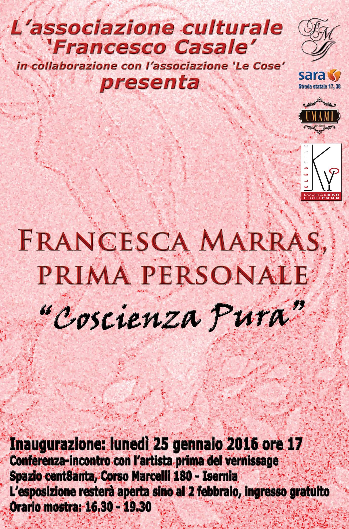 MANIFESTO MOSTRASi terrà a partire dal prossimo lunedì 25 gennaio nello spazio cent8anta in corso Marcelli 180 a Isernia la mostra di Francesca Marras “Coscienza pura” e organizzata dall’associazione Francesco Casale, con il supporto dell’associazione Le Cose, grazie alla collaborazione avviata nel mese di ottobre 2015.