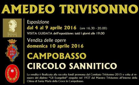 Da lunedì 4 aprile a domenica 10 aprile, il Comitato Trivisonno 2015 torna in campo per quello che è l’atto più importante dell’iniziativa di raccolta fondi ideata dallo stesso Comitato con l’obiettivo di finanziare il restauro dell’opera del Trivisonno “Gli Evangelisti”, presente nella volta della cappella dell’Addolorata della Chiesa di Santa Maria della Croce di Campobasso. Infatti, il Comitato Trivisonno 2015, in collaborazione con l’assessorato alla Cultura del Comune di Campobasso e con la Provincia di Campobasso, lunedì 4 aprile, alle 16.30, nelle sale del Circolo Sannitico in Piazza Pepe, inaugurerà ufficialmente l’esposizione di alcune opere di Amedeo Trivisonno che i figli dello stesso artista molisano hanno deciso di mettere in vendita per donarne il ricavato all’operazione di restauro.