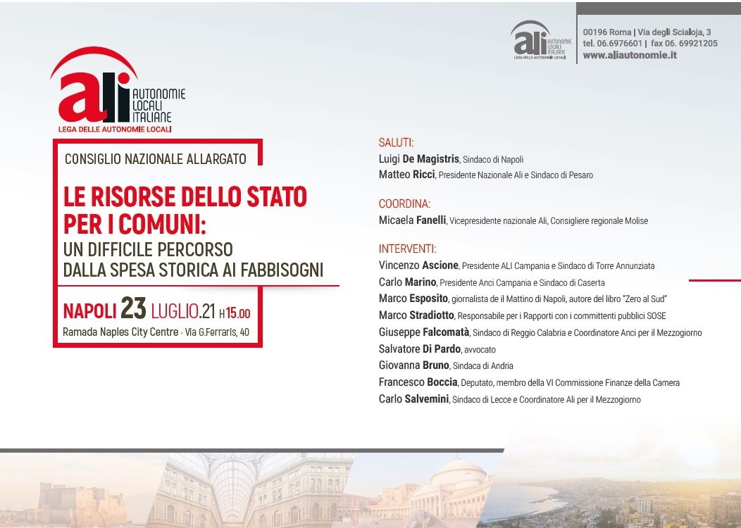 ‘Le risorse dello Stato per i Comuni: un difficile percorso dalla spesa storica ai fabbisogni’ il titolo dell’incontro che si terrà il prossimo 23 luglio a Napoli all’interno del Consiglio Nazionale allargato di ALI – Autonomie Locali Italiane promosso per dare un contributo importante al dibattito nazionale e che affronterà tre tematiche che caratterizzano il lavoro copioso che ALI sta portando avanti sul tutto il territorio nazionale.