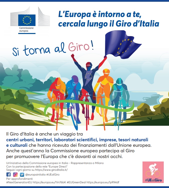 In questo momento di ripartenza dall’emergenza pandemica, mentre si preparano gli interventi straordinari del Next Generation EU, le tappe del Giro d’Italia mostreranno l’Europa che c’è già sul nostro territorio: laboratori scientifici, parchi industriali e archeologici, siti culturali e naturali, marchi protetti, reti di imprese, scuole, centri urbani, piste ciclabili e molto altro. Lungo la penisola, l’Unione europea pedala idealmente insieme ai ciclisti per promuovere la ripresa economica, la lotta al cambiamento climatico e un futuro più verde e inclusivo” dichiara Massimo Gaudina, capo della Rappresentanza a Milano della Commissione europea.