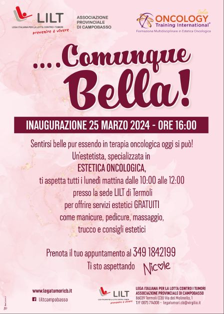 Il 25 marzo p.v. alle ore 16 la LILT di Campobasso inaugura il servizio di estetica oncologica presso la sede di Termoli in via del Molinello 1.