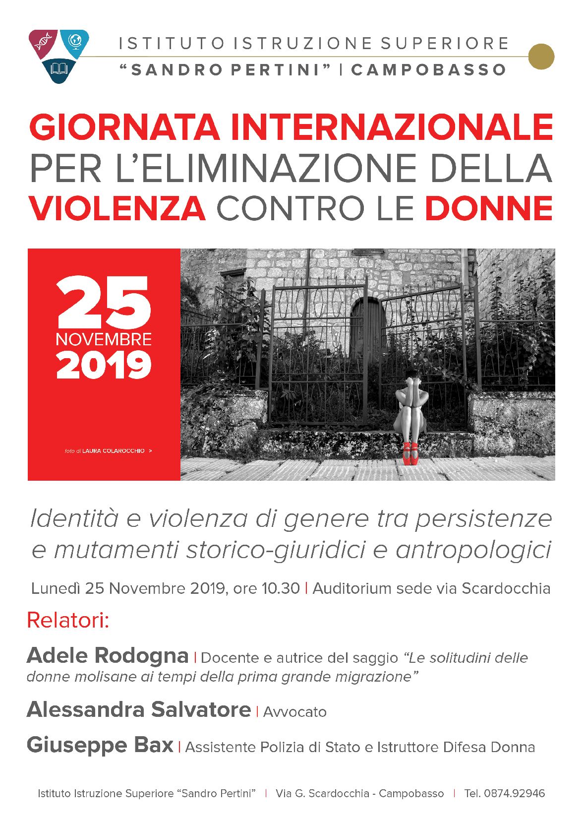 Lunedì 25 novembre ricorre la Giornata internazionale per l’eliminazione della violenza sulle donne, un appuntamento importante nell’ambito del quale l’Istituto Pertini-Montini-Cuoco di Campobasso organizzerà un incontro dal titolo ‘Identità e violenza di genere tra persistenze e mutamenti storico-giuridici e antropologici’ che si terrà a partire dalle ore 10,30, presso l’Auditorium dell’Istituto Biotecnologico in via Scardocchia.