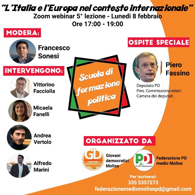 Lunedì 8 febbraio, alle ore 17,00, si terrà il quinto webinar della scuola di formazione politica organizzata dai Giovani Democratici del Molise insieme alla Federazione PD Medio Molise.