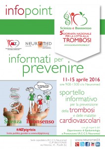 In occasione della quinta Giornata Nazionale per la lotta alla Trombosi, che si celebra il 13 aprile, il Neuromed di Pozzilli apre per tutta la prossima settimana uno sportello di informazione, prevenzione e dialogo con i cittadini sulle patologie legate alla trombosi. A disposizione di tutti e completamente gratuito, lo sportello si inquadra nelle iniziative organizzate in tutta Italia da Alt, Associazione per la Lotta alla Trombosi e alle malattie cardiovascolari – Onlus. Sarà l’occasione per conoscere meglio i propri rischi di malattia e valutare tutto ciò che possiamo fare nella nostra vita quotidiana per prevenire patologie spesso molto serie.