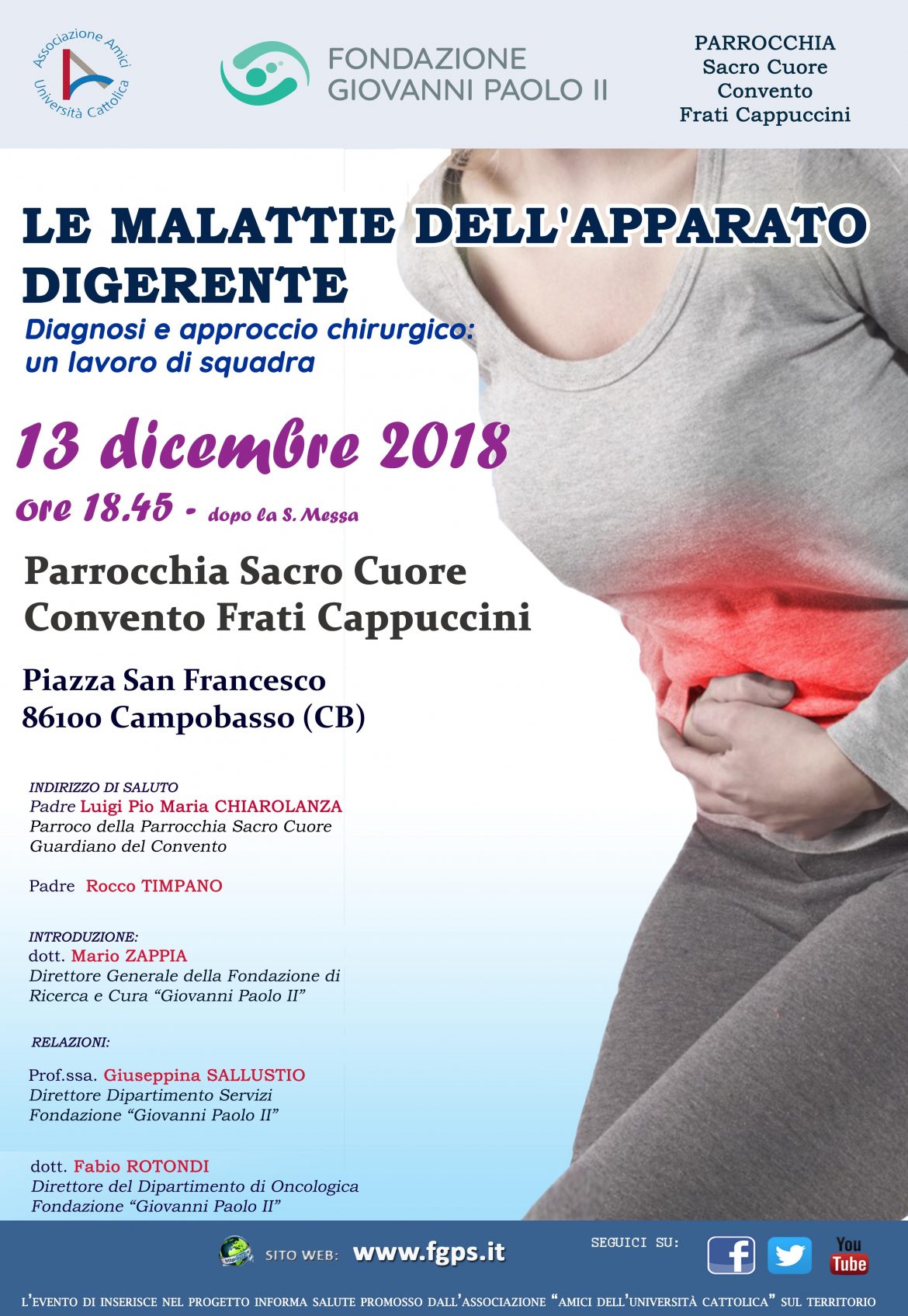 Quasi il 90% degli italiani dichiara che, almeno una volta, ha sofferto di disturbi gastrointestinali. L’argomento sarà affrontato nel corso del convegno: ‘Le malattie dell’Apparato Digerente, approccio medico e chirurgico’, promosso dalla Fondazione Giovanni Paolo II e dall’Associazione A.Barelli – Amici della Cattolica in collaborazione con la Parrocchia Sacro Cuore – Convento Cappuccini di Campobasso il prossimo giovedì 13 dicembre alle 18.45 presso i locali in Piazza San Francesco, 12.