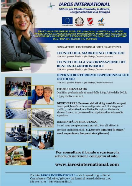 La Regione Molise ha approvato e finanziato il percorso formativo per tre importanti corsi organizzati da Iaros International, ente di formazione accreditato con sede a Campobasso.