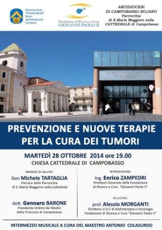 Diagnosi precoce, prevenzione, screening ma anche nuovi farmaci molecolari ed analisi più mirate e meno invasive: questo è quello di cui si discuterà domani – martedì, 28 ottobre – alle ore 19 nella Chiesa Cattedrale di Campobasso dove di terrà il Convegno ‘Prevenzione e nuove terapie per la cura dei tumori‘ organizzato dalla Fondazione di Ricerca e Cura ‘Giovanni Paolo II’, l’Associazione ‘Amici dell’Università Cattolica’ e Arcidiocesi di Campobasso Bojano.