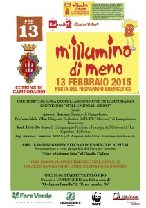 Venerdì 13 febbraio, in occasione della Giornata del Risparmio Energetico, dedicata all’ormai consueto simbolico “silenzio energetico”, il Comune di Campobasso, con il sostegno e la collaborazione dell’Associazione Ambientalista Fare Verde, di Legambiente Molise, del WWF Molise e della BiblioMediaTeca comunale di Campobasso, aderirà a M’illumino di Meno 2015, ovverola più grande campagna radiofonica di sensibilizzazione sulla razionalizzazione dei consumi energetici, ideata da Caterpillar, storico programma in onda da diciotto anni su Radio 2 RAI dalle 18 alle 19,30.