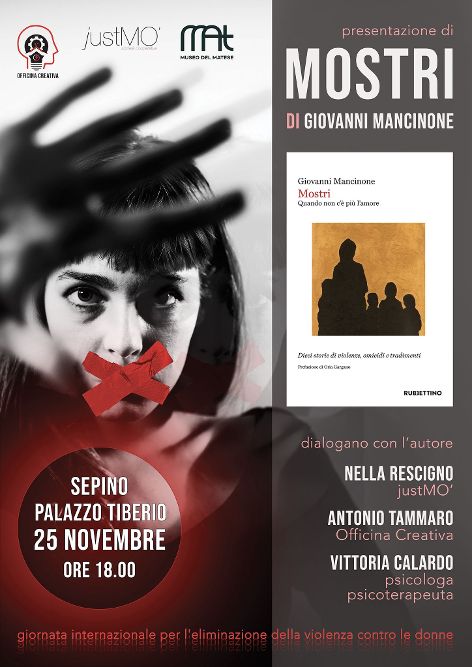 A Sepino, alle ore 18, nella cornice storica di Palazzo Tiberio, Mostri verrà presentato in un dialogo pubblico che coinvolgerà l’autore e tre figure di rilievo nell’ambito del sociale e della cultura: Nella Rescigno (justMO’), Antonio Tammaro (Officina Creativa) e Vittoria Calardo, psicologa e psicoterapeuta.