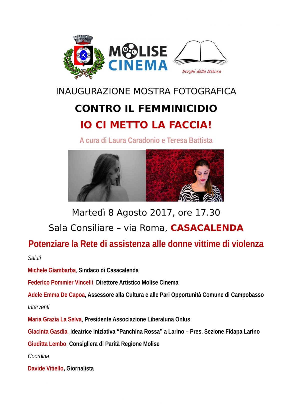 Nell’ambito della quindicesima edizione del MoliseCinema Film Festival, martedì 8 agosto alle ore 17,30, nella sala consiliare del Comune di Casacalenda, sarà inaugurata la mostra fotografica dal titolo “Contro il femminicidio io ci metto la faccia”, ideata e curata da Laura Caradonio e Teresa Battista. A seguire si terrà la tavola rotonda sul tema “Potenziare la rete di assistenza alle donne vittime di violenza”.La tavola rotonda sarà aperta dai saluti di Michele Giambarba, Sindaco di Casacalenda, e Federico Pommier Vincelli, direttore artistico di Molise Cinema. Interverranno a seguire Emma de Capoa, assessore alla cultura e alle pari opportunità del Comune di Campobasso; Maria Grazia La Selva, presidente Associazione Liberaluna Onlus; Giacinta Gasdia, ideatrice dell’iniziativa “Panchina Rossa” e Presidente della sezione Fidapa di Larino.