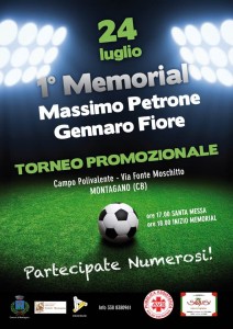 Domani, domenica 24 luglio 2016, dalle ore 17 a mezzanotte si terrà il primo memorial promozionale di calcio a 5 “Fiore – Petrone”, presso il campo polivalente in Via Fonte Moschitto a Montagano.