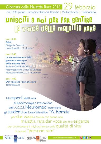 Con questo seminario il Neuromed invita tutti ad un momento di riflessione sulle reali problematiche che i pazienti affetti da Malattie Rare si trovano ad affrontare quotidianamente e, in quanto Centro di riferimento per queste malattie, apre le porte al confronto e alle necessità dei malati e dei loro familiari. Ma la sensibilizzazione e la conoscenza delle Malattie Rare parte soprattutto dai giovani. La Fondazione Neuromed continua per questo a promuovere incontri formativi con i ragazzi delle scuole. Lunedì, 29 febbraio 2016, il dottor Stefano Gambardella, responsabile del Centro di Genetica molecolare dell’I.R.C.C.S. Neuromed terrà una lezione “Le nuove frontiere della genetica a sostegno delle Malattie Rare” ai ragazzi del Liceo Scientifico“Romita” di Campobasso, una scuola che da anni partecipa attivamente alle iniziative dedicate a questa giornata. L’incontro, che inizierà alle ore 10,30 presso l’Istituto scolastico del capoluogo, vedrà la presenza dei ricercatori del Dipartimento di Epidemiologia e Prevenzione Neuromed nonché la testimonianza di alcune “persone rare”.