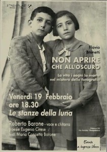 locandinaNuovo evento nell’ambito della mostra fotografica curata da Flavio Brunetti “Non aprire che all’oscuro”, con il concerto recital “Le stanze della luna” che si terrà venerdì 19 febbraio alle 18.30, nella sala 1 della galleria del palazzo Gil a Campobasso. In programma l’opera in musica sulle liriche di Eugenio Cirese, elaborazione in prosa di Maria Concetta Barone, scrittura musicale originale e interpretazione di Roberto Barone.