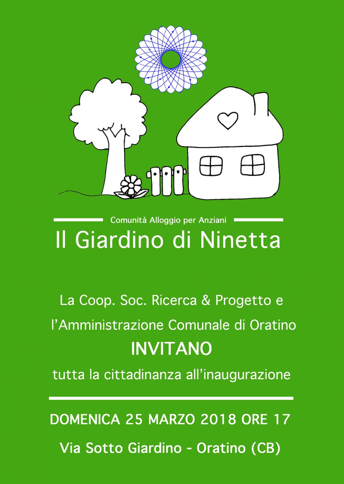 Il 25 marzo ad Oratino sarà inaugurata una comunità alloggio per anziani e per malati di Alzheimer. La struttura, in via Sotto Giardino, è stata realizzata grazie alla volontà dell’amministrazione comunale di Oratino, capeggiata dal sindaco, Luca Fatica, e dall’interessamento della Cooperativa Sociale Ricerca e Progetto di Campobasso, l’azienda che ha risposto all’evidenza pubblica proposta dall’Ente e che gestirà, a partire dal prossimo 2 aprile, “Il Giardino di Ninetta”. Questo sarà infatti il nome della struttura.