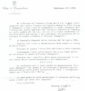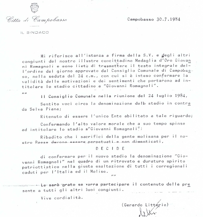 “Ancora una volta – scrivono Pilone e Cancellario – ci troviamo a discutere di un tema ampiamente ‘sviscerato’ e dibattuto che pensavamo fosse stato definitivamente archiviato alla luce degli atti comunali esistenti. Vogliamo ricordare, per l’ennesima volta, che prima della approvazione della mozione del 2009 in Consiglio Comunale, richiamata nell’ordine del giorno presentato dai colleghi, esiste agli atti una delibera di consiglio comunale che provvede ad intitolare lo stadio di Selva piana all’eroe di guerra Giovanni Romagnoli, corredata dalle comunicazioni fatte alla famiglia stessa, a firma dell’allora sindaco Gerardo Litterio, in merito al provvedimento effettuato”.