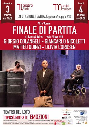 Domenica 3 marzo, alle ore 18 e lunedì 4 marzo alle ore 20.30 presso ‘Il Teatro del Loto’ di Ferrazzano, Altra Scena presenta ‘Finale di partita’ di Samuel Beckett con Giorgio Colangeli Giancarlo Nicoletti Matteo Quinzi Olivia Cordsen regia Filippo Gili.