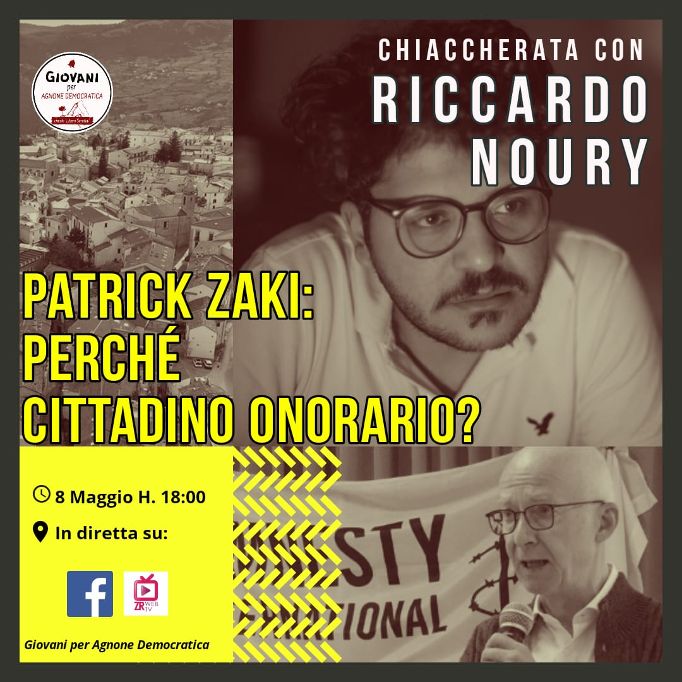 Continuano gli eventi online del gruppo ‘Giovani per Agnone Democratica’. Dopo aver discusso su tematiche legate alla mafia e agli effetti psicologici prodotti dalla DAD, il gruppo politico propone un incontro online dal titolo “Patrick Zaki: perché cittadino onorario?” con la partecipazione di Riccardo Noury, Portavoce di Amnesty International Italia.