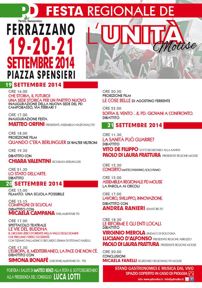 A chiudere la giornata il confronto su riforme ed enti locali al quale oltre al numero uno del Molise, Frattura, prenderanno parte il presidente della Regione Abruzzo Luciano D’Alfonso, i sindaci di Isernia e Trivento, Luigi Brasiello e Domenico Santorelli, nonchè e l’assessore al Comune di Agnone, Maurizio Cacciavillani. La chiusura delle tre giornate sarà poi affidata al sottosegretario alla presidenza del Consiglio Luca Lotti, unitamente al segretario del Pd Molise, Micaela Fanelli.
