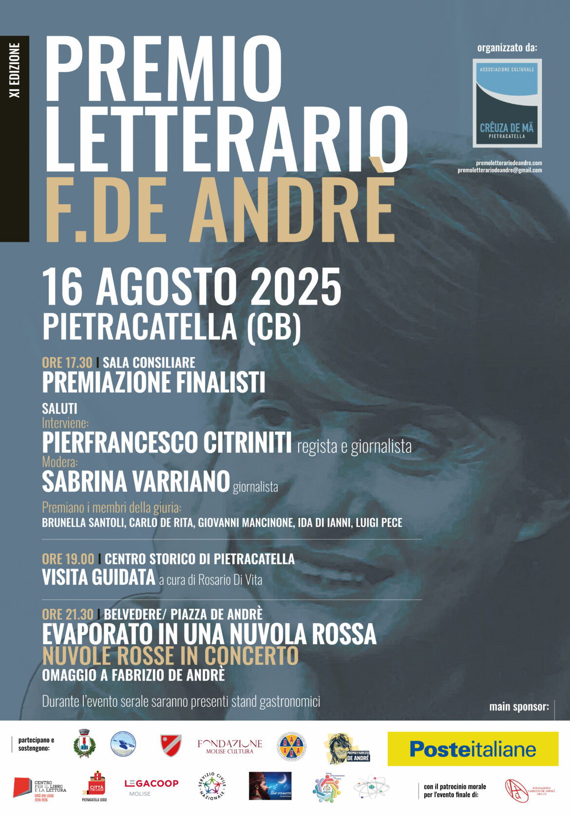 Interverranno alcuni componenti della giuria, composta da figure autorevoli del panorama culturale nazionale: la docente e scrittrice Ida Di Ianni, il professor Carlo De Rita dell’Università degli Studi della Campania “Luigi Vanvitelli” e il giornalista Giovanni Mancinone. L’iniziativa si avvale del sostegno di Poste Italiane, nell’ambito delle politiche di valorizzazione dei piccoli comuni, e di Legacoop Molise. A conferirle ulteriore prestigio, i patrocini della Fondazione Fabrizio De André Onlus – da sempre al fianco del Premio – del Premio De André “Parlare Musica”, della Regione Molise, dell’Istituto di Istruzione Superiore “M. Pagano” di Campobasso (con il Liceo Scientifico “G. Galilei” di Riccia), dell’Istituto Omnicomprensivo del Fortore, della Pro Loco Pietramurata, dell’APS “San Donato – Pietracatella”, della Fondazione Molise Cultura e dell’Università degli Studi del Molise.