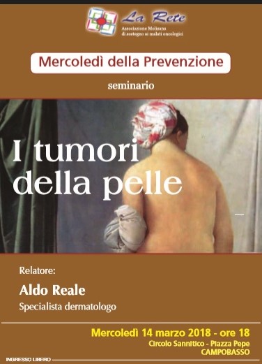Continuano gli appuntamenti promossi da La Rete Onlus, associazione molisana di sostegno ai malati oncologici. Nuovo incontro in programma mercoledì 14 marzo 2018 alle 18 al Circolo Sannitico, in Piazza Pepe a Campobasso, con l’incontro denominato “I tumori della pelle”. L’evento vedrà la partecipazione dello specialista dermatologo Aldo Reale.
