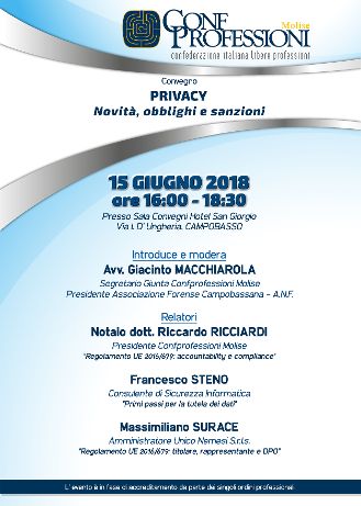 Ad introdurre e moderare i lavori l’avvocato Giacinto Macchiarola. Tra i relatori il presidente di Confprofessioni Molise, Riccardo Ricciardi, che si soffermerà su ‘Regolamento UE 2016/679: accountability e compliance’