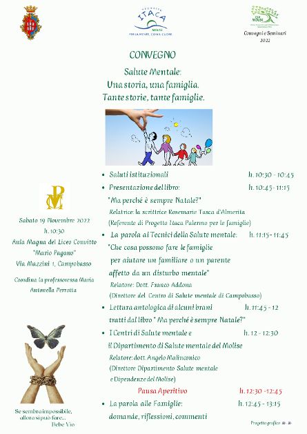 ‘Salute mentale: una storia, una famiglia. Tante storie, tante famiglie’, questo il tema al centro del convegno in programma sabato 19 novembre 2022 a partire dalle ore 10.30 nell’aula magna del Convitto Mario Pagano in via Mazzini a Campobasso.