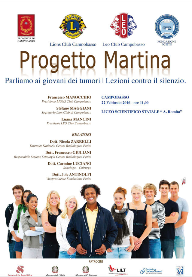 Domani, lunedì 22 febbraio 2016, alle ore 11 al Liceo Scientifico “A. Romita” di Campobasso, si svolgerà il primo incontro organizzato dal Lions Club di Campobasso nell’ambito del Service Nazionale “Progetto Martina: parliamo ai giovani di tumori” patrocinato dal Senato della Repubblica, Ministero della Salute, Ministero dell’Istruzione, la LILT, Fondazione Umberto Veronesi ed Europa Donna Forum Italiano.