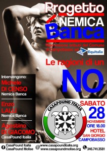 ‘Usura arrugginisce il cesello, arrugginisce arte e artigiano, tarla la tela nel telaio’ . Questi i versi del poeta Ezra Pound scelti da CasaPound Italia per promuovere la conferenza di presentazione del progetto ‘Nemica Banca’ che avrà luogo sabato 28 novembre a Campobasso alle ore 18 nella sala conferenze dell’Hotel ‘San Giorgio’, in risposta alla scelta da parte dell’amministrazione comunale del capoluogo molisano di affidare ‘in via temporanea’ la riscossione la riscossione coattiva dei tributi ad Equitalia.