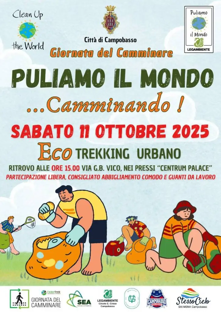 Si terrà sabato 11 ottobre 2025, con inizio alle ore 15, l’edizione campobassana di “Puliamo il Mondo… camminando”, l’iniziativa che coniuga il piacere del cammino con la cura degli spazi comuni. L’evento, promosso dal Circolo Legambiente “E. Cirese”, si svolgerà in collaborazione con il Comune di Campobasso, l’associazione Giambattista Vico, la scuola Minibasket Campobasso e il SAI “Stesso Cielo”, nell’ambito del programma nazionale Clean Up the World e della Giornata del Camminare.