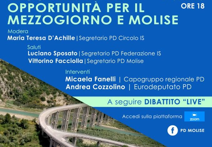 Il rilancio dell’economia molisana attraverso le risorse previste dal Recovery Plan: se ne discuterà martedì 19 gennaio in diretta alle ore 18:00 sulla piattaforma Zoom del Partito Democratico di Isernia.