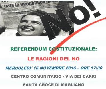 Proseguono le iniziative pubbliche promosse dal Comitato per il ‘no’ al referendum costituzionale nei comuni del Basso Molise. Mercoledì 16 novembre dalle 17:30 presso il centro Comunitario di via dei Carri a Santa Croce di Magliano, si terrà un incontro con la cittadinanza per illustrare le ragioni del ‘no’ all’importante referendum in programma domenica 4 dicembre.
