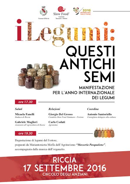 Sabato 17 Settembre, alle ore 17,30 nei locali del Circolo Anziani di Riccia dopo i saluti del sindaco Micaela Fanelli e dell’assessore all’agricoltura Gabriele Maglieri, terranno due relazioni sulla storia e la coltura dei legumi in Italia e nella valle del Fortore, oltre sui benefici effetti che essi hanno nell’alimentazione umana e animale, il fiduciario della Condotta Slow Food Tammaro-Fortore Giorgio Del Grosso, e l’agronomo Carlo Coduti. L’incontro sarà moderato da Antonio Santoriello, consigliere delegato alla Cultura e promotore dell’iniziativa. In serata degustazione guidata di legumi del Fortore Degustazione, a cura di Mariantonietta Moffa dell’Agriturismo “Masseria Pasqualone”, il tutto accompagnato da buona musica.
