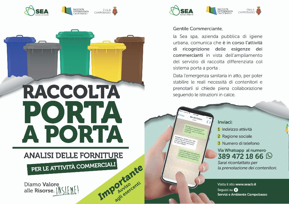 È stata avviata lo scorso 8 marzo la ricognizione territoriale delle utenze domestiche e non domestiche nelle zone di contrada Vazzieri e del centro murattiano di Campobasso. Si tratta di un lavoro preliminare attivato dalla società pubblica Servizi e Ambiente (SEA) per determinare l’esatto fabbisogno dei contenitori delle utenze e riscontrare eventuali criticità.