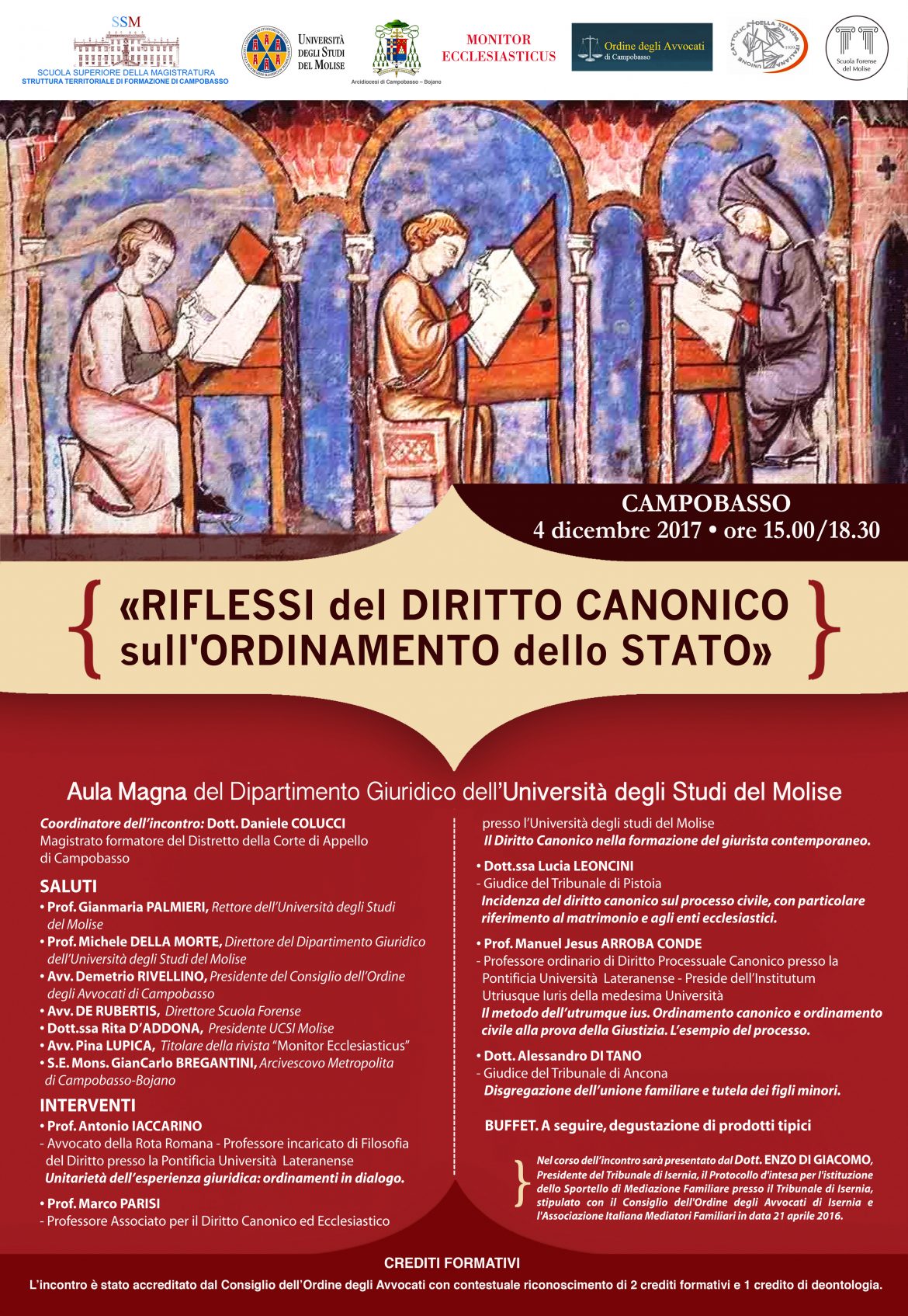 Lunedì 4 dicembre 2017, alle ore 15:00, presso l’aula Magna del Dipartimento Giuridico (viale Manzoni) dell’Università per gli Studi del Molise, avrà luogo un convegno di formazione e di studio sui riflessi, notevoli dell’ordinamento canonico su quello dello Stato, con particolare riferimento alla materia familiare e al regime dei beni ecclesiastici, non senza un approfondimento dei risvolti di ordine processuale.