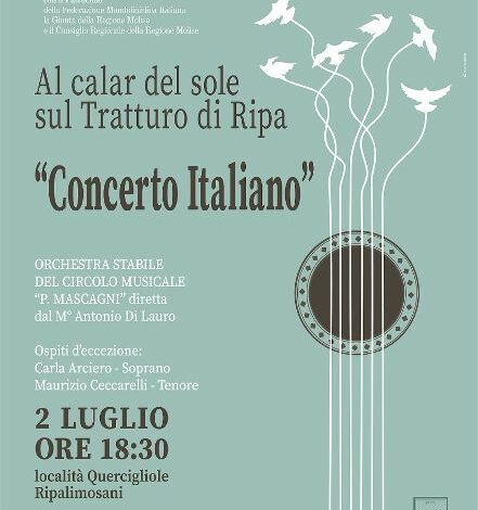 Un “Concerto italiano” questa volta al tramonto intratterrà il pubblico, in una location unica e tipica del territorio molisano, con le più belle melodie del melodramma italiano. Protagonista sarà ancora una volta l’orchestra Stabile a plettro ed a pizzico del Circolo Musicale “P. Mascagni” diretta dal M° Antonio Di Lauro.