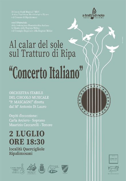 Un “Concerto italiano” questa volta al tramonto intratterrà il pubblico, in una location unica e tipica del territorio molisano, con le più belle melodie del melodramma italiano. Protagonista sarà ancora una volta l’orchestra Stabile a plettro ed a pizzico del Circolo Musicale “P. Mascagni” diretta dal M° Antonio Di Lauro.