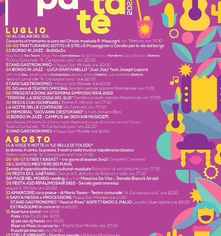 Il prossimo appuntamento è BORGO IN JAZZ, sabato 23 luglio e domenica 24, con gli stand gastronomici in piazza. Il 25 TEATRO OFFICINA al Giardino pensile del palazzo Marchesale, che ospiterà anche “TERRONI, LA RISCOSSA DEL SUD”. Spazio ai più piccoli il 30 luglio con I GONFIABILI in piazza, una festa seguita dalla NOTTE DELLE CONTRADE dall’ora di cena in poi. Lo sport vedrà il 31 il MEMORIAL “GIOVANNI CRISTOFARO”, seguito in serata dal CAMPUS dei GIOVANI MUSICISTI.