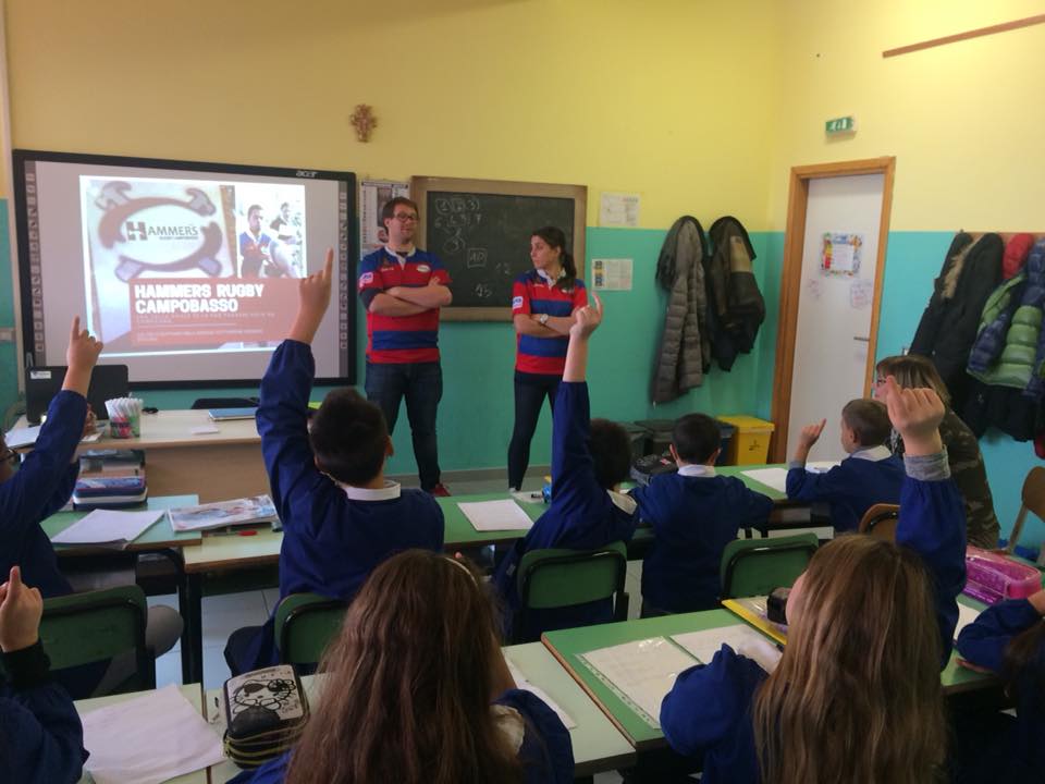 La palla da rugby continua a passare di mano da un’istituto scolastico all’altro e, dopo l’Istituto Colozza di Campobasso, gli Hammers Rugby sono stati invitati a parlare del loro sport e dei valori sui quali si basa, dai ragazzi della classe V della scuola primaria di Ferrazzano e dalle loro maestre.