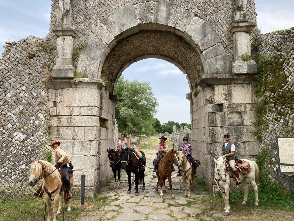 Questa via millenaria della lana, di greggi e pastori si riempie di gloria là dove il cardo e il decumano s’incrociano. Dalla notte dei tempi il suo cammino attraversa il cuore della città lastricata di pietra. Probabilmente l’andirivieni istintivo avviene fin dalla nascita delle prime popolazioni italiche. Al tramonto, tra toni d’azzurro, riflessi sparsi tinti di giallo, voci umane e versi di animali, la vita dell’intero contesto ambientale segretamente si anima. Nel suo insieme questo paesaggio di antica memoria ricoperto di verde, che a cascata discende dalle cime del Matese, regala all’antico municipium romano una scena inedita. Saepinum, roccaforte dei Sanniti e città romana autorizzata a controllare il traffico delle pecore, è ancora tutta da scoprire. Tra le tante città romane dissepolte è unica. Puntualmente svela l’anima delle sue forme di vita più graziose. Ha un cuore sempre aperto. Di sera è la più romantica. Da sempre si riveste di bello. Non ha nulla da invidiare ai siti archeologici più noti. Raggiunta a cavallo, poi, come affermano Laura e Paolo, due guide esperte che accompagnano gruppi di turisti sui tratturi di questa terra antichissima, regala puntualmente un ampio ventaglio di emozioni seducenti. Il reportage fotografico riproduce fedelmente la magìa che questo percorso consente a chiunque di vivere. I viaggi dell’Associazione Equestre Riding Holidays partono alla scoperta di un bel tratto del regio tratturo Pescasseroli – Candela per giungere all’antica città di Saepinum.