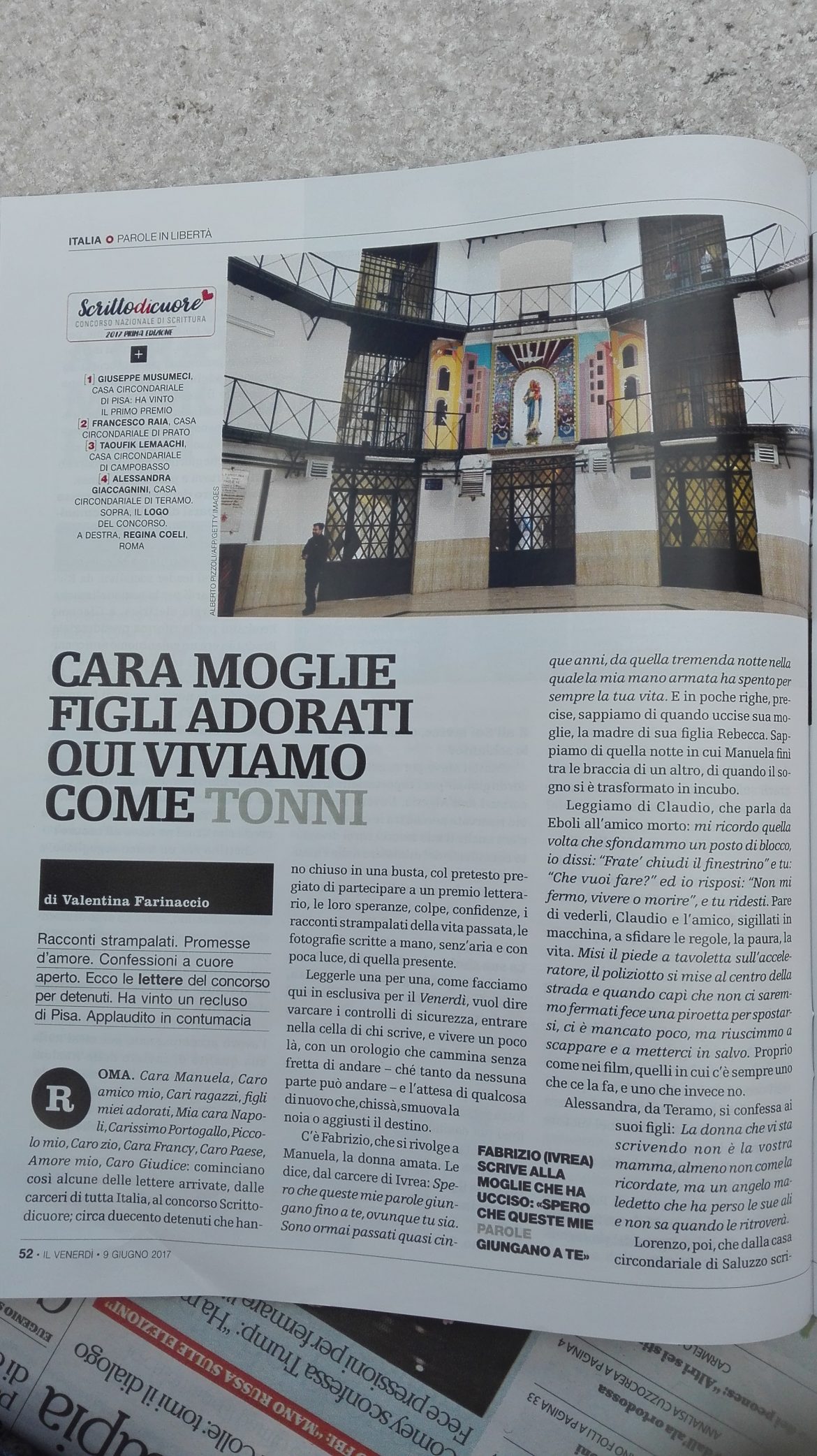 L’edizione in edicola oggi 9 giugno 2017 de “Il venerdì”, autorevole supplemento del quotidiano La Repubblica, dedica due intere pagine alla rassegna ‘Scritti di Cuore’ promossa e organizzata dall’assessorato alle Politiche per il sociale e giovanili del Comune di Campobasso, dall’Uli (Unione Italiana Lettori), dall’Ambito Territoriale Sociale in collaborazione con la Provincia, la Casa Circondariale di Campobasso, BeFree Molise e attraverso la sinergia con il tessuto scolastico. Due pagine per raccontare, in sintesi, l’obiettivo del progetto, le finalità di questa rassegna-concorso che vuole aprirsi a chi è recluso, a chi vive dietro le sbarre, a chi sta pagando il conto con la giustizia facendo i conti con la propria coscienza e con una società spesso troppo lontana dalle mura del carcere. Da qui, dunque, l’esigenza di scrivere, anzi di far scrivere lettere ai detenuti che hanno raccolto l’invito e partecipato, da tutta Italia, al concorso vinto da Giuseppe Musumeci, ospite della casa circondariale di Pisa.