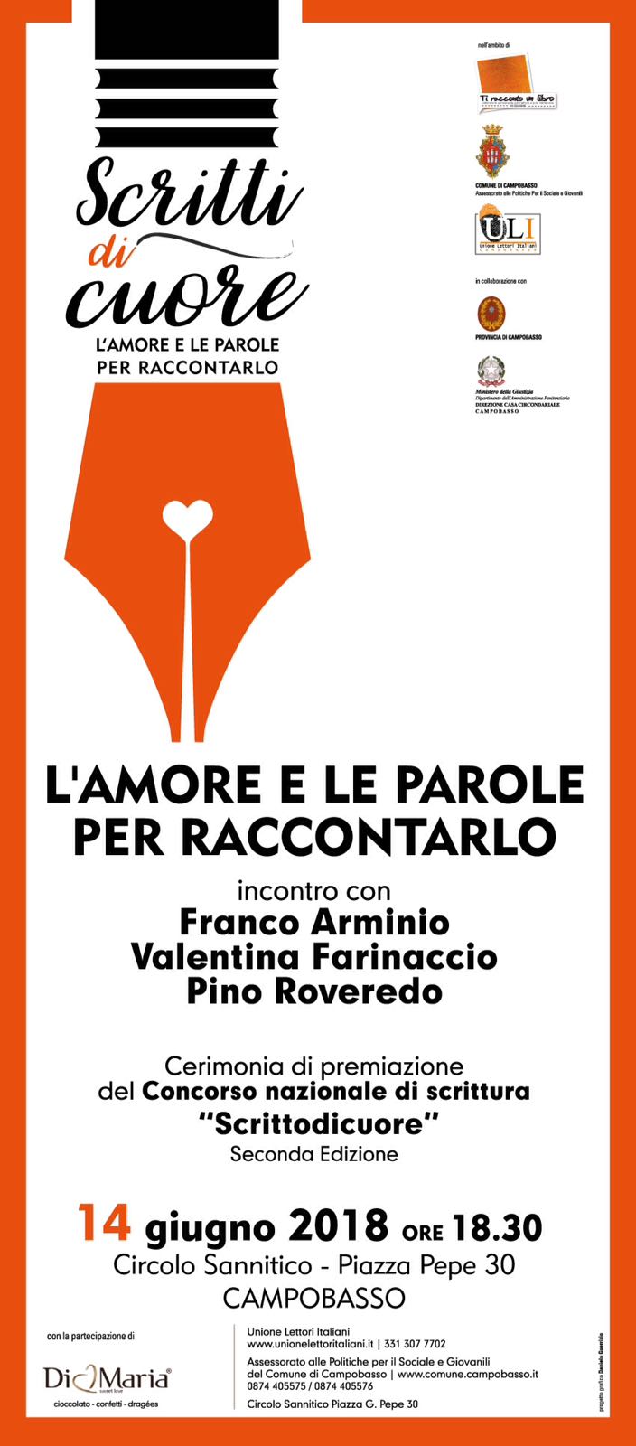 La seconda edizione del ciclo di incontri Scritti di cuore, promossa e organizzata dall’Assessorato alle Politiche per il sociale e Giovanili Comune di Campobasso e dall’Unione Lettori Italiani, con la direzione artistica di Brunella Santoli in collaborazione con la Provincia e la Direzione della Casa Circondariale di Campobasso, e attraverso la sinergia con il tessuto scolastico del capoluogo, rientra nel programma di Ti racconto un libro 2017-2018, ed è articolata in un percorso a tappe che dal febbraio scorso ha accompagnato il pubblico nella conoscenza dell’intricato labirinto sentimentale che tutti noi sperimentiamo.