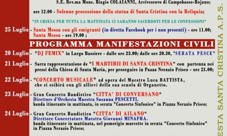 Secondo gli studi più accreditati, tale devozione si consolidò nel corso del XVII secolo, quando le reliquie della santa — parte delle quali sarebbero tuttora conservate nella chiesa madre del borgo molisano — divennero meta di pellegrinaggi e segno di prodigi. Lo storico Pietro Paolo Di Zinno, nel suo Trattato delle cose molisane (1654), menziona Santa Cristina come esempio di resistenza spirituale e di protezione celeste contro le calamità. Il momento culminante delle celebrazioni è previsto per giovedì 24 luglio, alle ore 11.00, con la Solenne Celebrazione Eucaristica presieduta dall’Arcivescovo di Campobasso-Bojano, S.E. Mons. Biagio Colaianni, cui seguirà la tradizionale processione con la statua della santa e la reliquia. Tra gli appuntamenti più sentiti non mancherà la Messa per gli emigranti, in programma il 25 luglio e anche in diretta online, nonché la storica Festa dell’Emigrante, giunta alla 122ª edizione, che vedrà esibirsi Roberta Faccani (già voce dei Matia Bazar) e la DJ Giada. Il calendario civile prevede inoltre concerti bandistici, rievocazioni religiose, stand gastronomici e il consueto spettacolo pirotecnico serale del 24 luglio. Spazio alla cultura il 28 luglio con il convegno dedicato ai cento anni del Giornale di Santa Cristina, mentre il 16 agosto si concluderà il ciclo festivo con l’estrazione della lotteria in Piazza Nerazio Prisco.